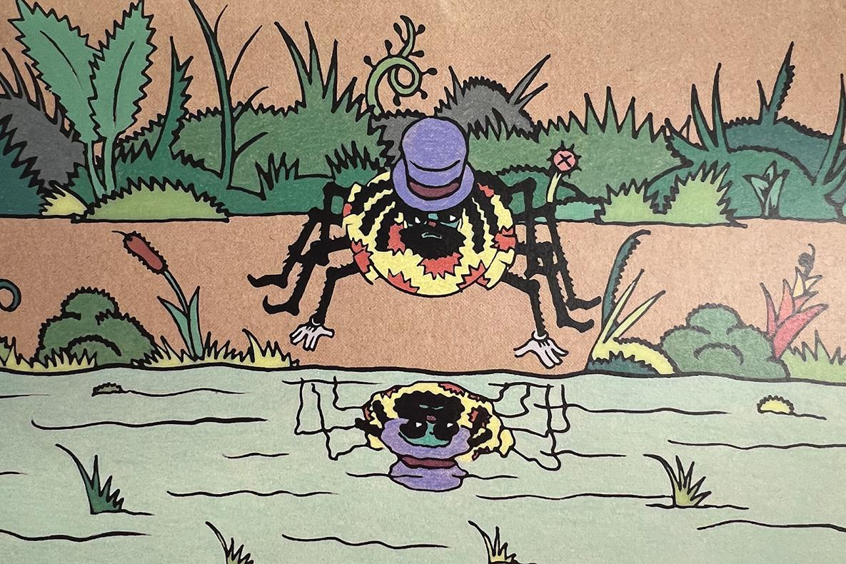 Anansi the Spider looks at his reflection in the water, from the book Anansi written by Brian Gleeson and illustrated by Steven Guarnaccia, 1992.