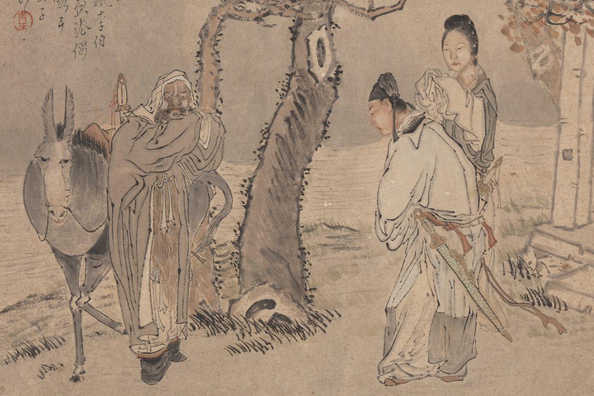 Three Heroes of the Wind and Dust 風塵三俠 by Qian Hui’an 錢慧安 (1833-1911), National Palace Museum, Taipei. The trio of Qiuranke 虯髯客, Li Jing 李靖, and Hongfu 紅拂 are legendary heroes who lived through the tumultuous transition from the Sui Dynasty (581–618) to the Tang Dynasty (618–907).